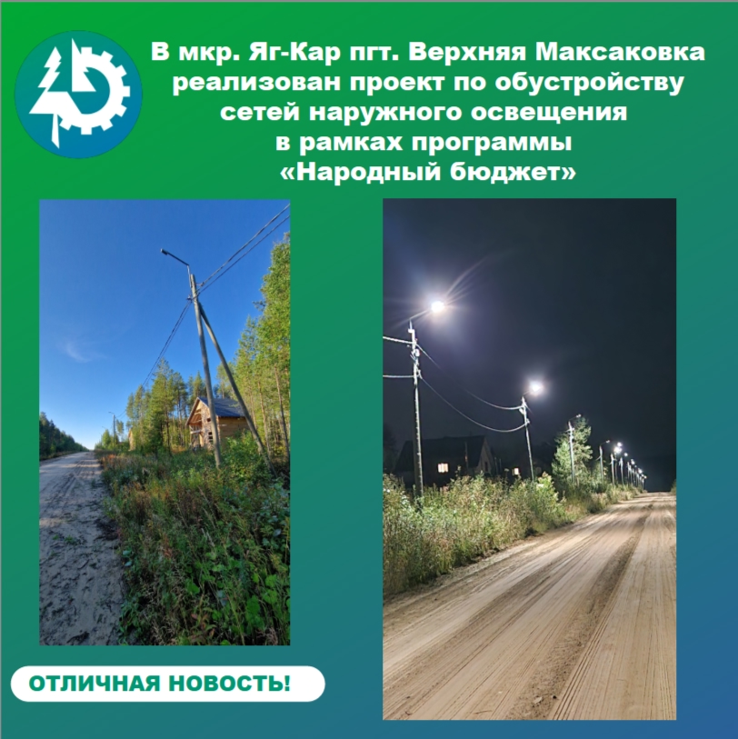 На территории пгт. Верхняя Максаковка в мкр. Яг-Кар в рамках программы «Народный бюджет» реализован проект «Устройство сетей наружного освещения от КТП-53 в мкр. Яг-Кар, пгт. В. Максаковка, г. Сыктывкара (части ул. 6-я линия, ул. 7-я линия, ул. 1-я Белоборская, ул. 2-я Белоборская)».