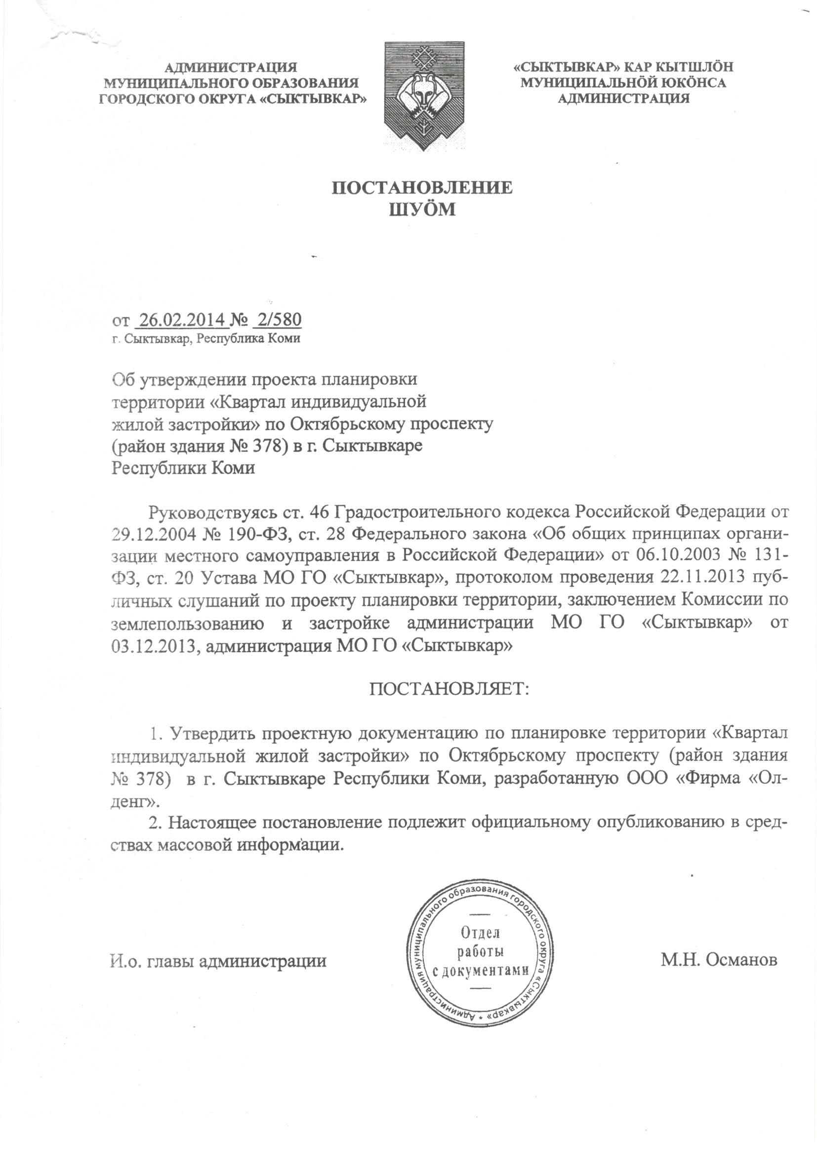 Постановление администрации МО ГО «Сыктывкар» от 26.02.2014 № 2/580 "Об утверждении проекта планировки территории "Квартал индивидуальной жилой застройки" по Октябрьскому проспекту (район здания № 378) в г. Сыктывкаре Республики Коми"
