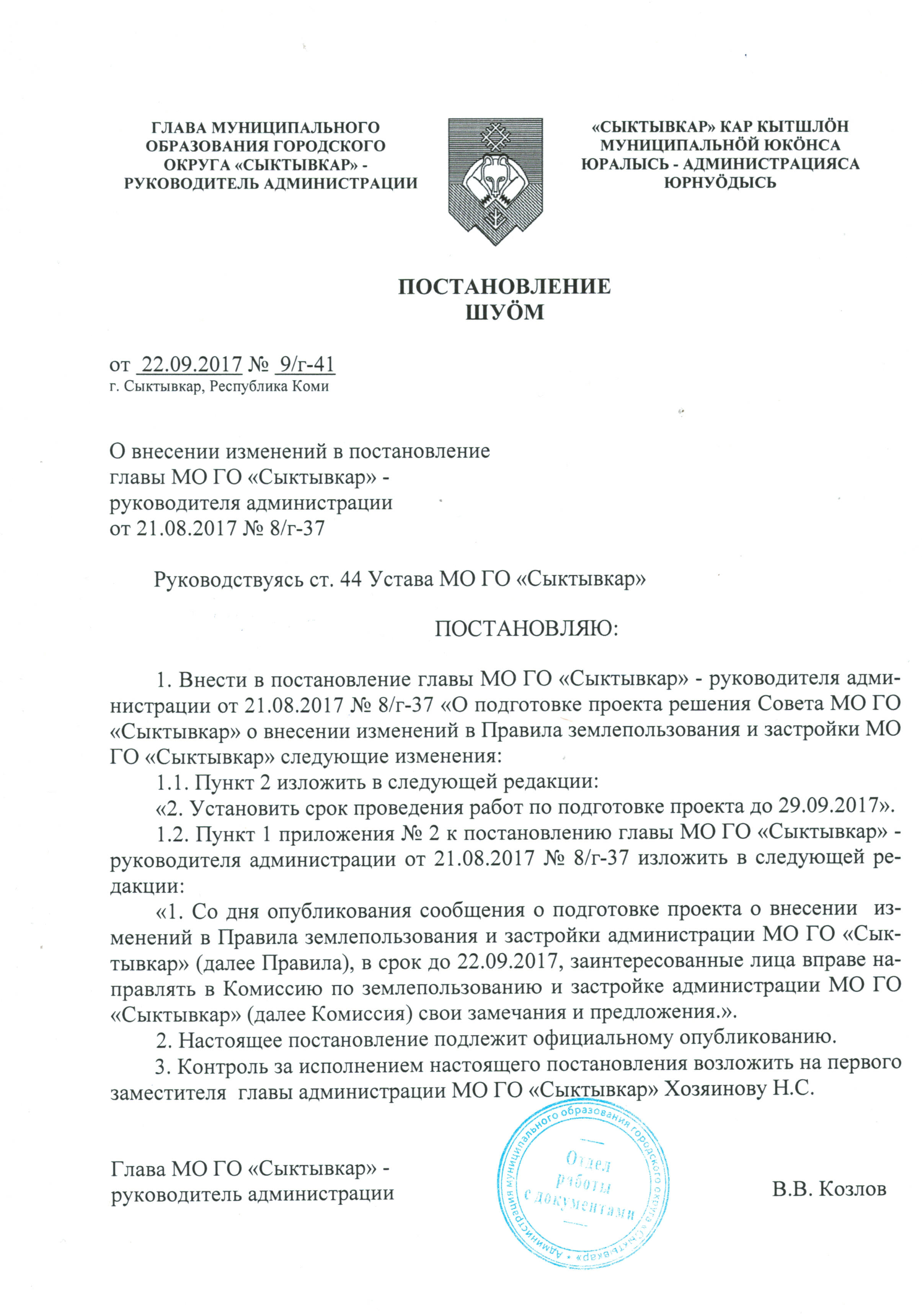 Постановление главы МО ГО «Сыктывкар» — руководителя администрации от 22.09.2017 № 9/г-41 «О внесении изменений в постановление главы МО ГО „Сыктывкар“ — руководителя администрации от 21.08.2017 № 8/г-37»