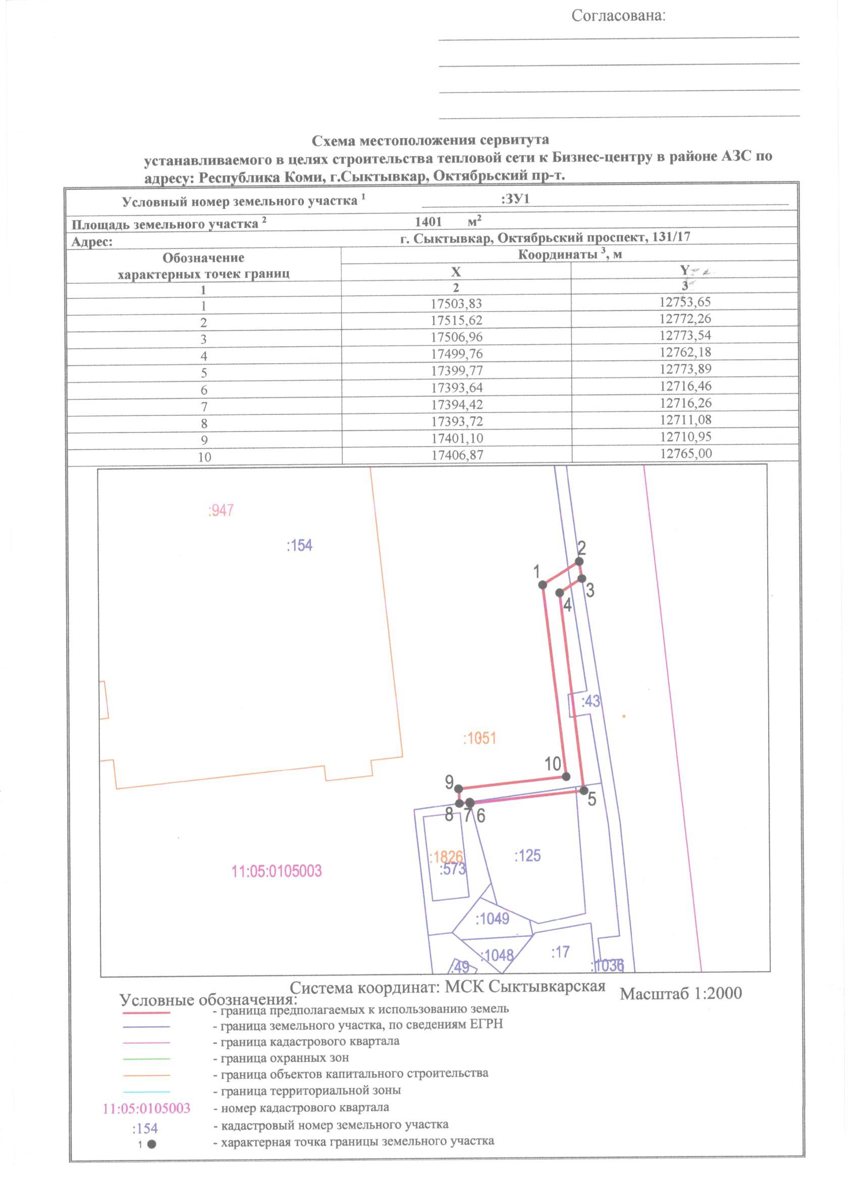 Земельный участок, в отношении которого испрашивается публичный сервитут, расположен в кадастровом квартале 11:05:0105003 в районе здания по адресу: Республика Коми, г. Сыктывкар, Октябрьский проспект, д. 131/3, согласно схеме.