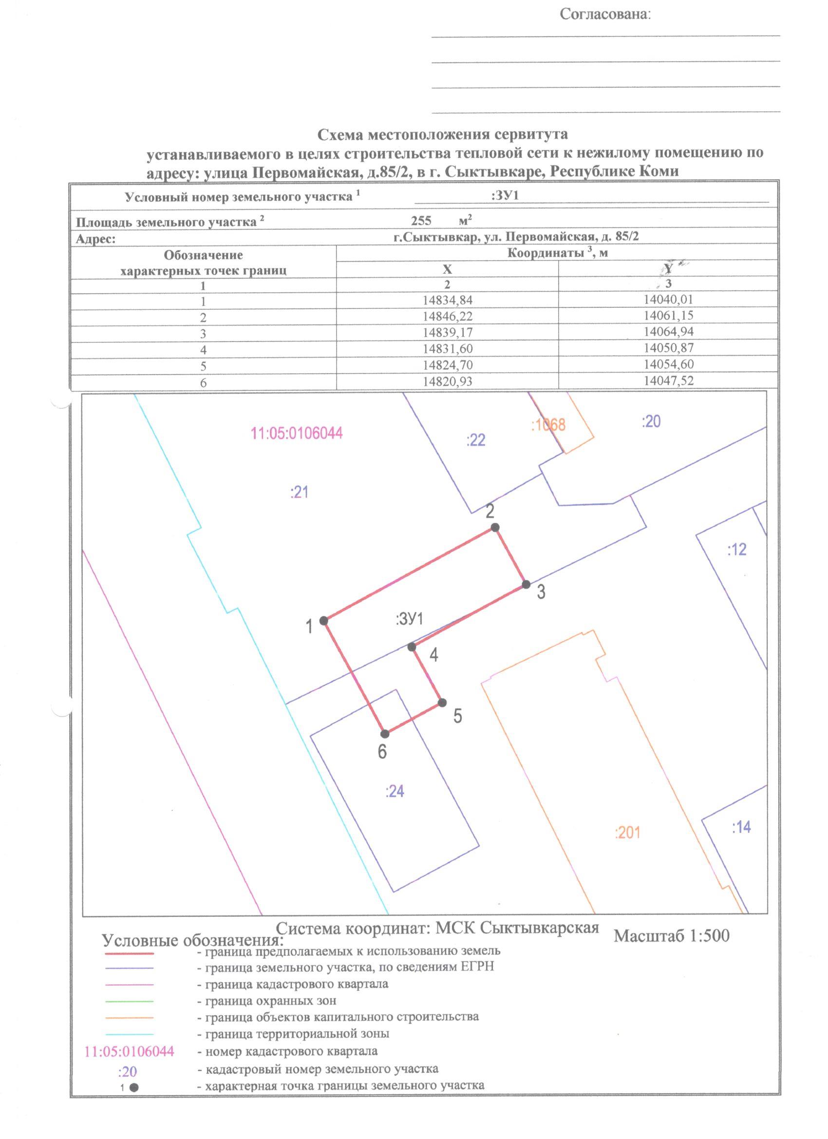 Земельный участок, в отношении которого испрашивается публичный сервитут, расположен в кадастровом квартале 11:05:0106044 в районе здания по адресу: Республика Коми, г. Сыктывкар, ул. Первомайская,85/2, согласно схеме.