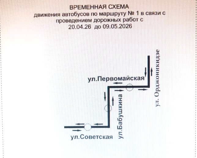 Временная схема движения автобусов по маршруту № 1 «Школа № 33 - ТРЦ «Макси» в связи с проведением ремонтных работ по ул. Интернациональная с 20.04.2026 по 09.05.2026