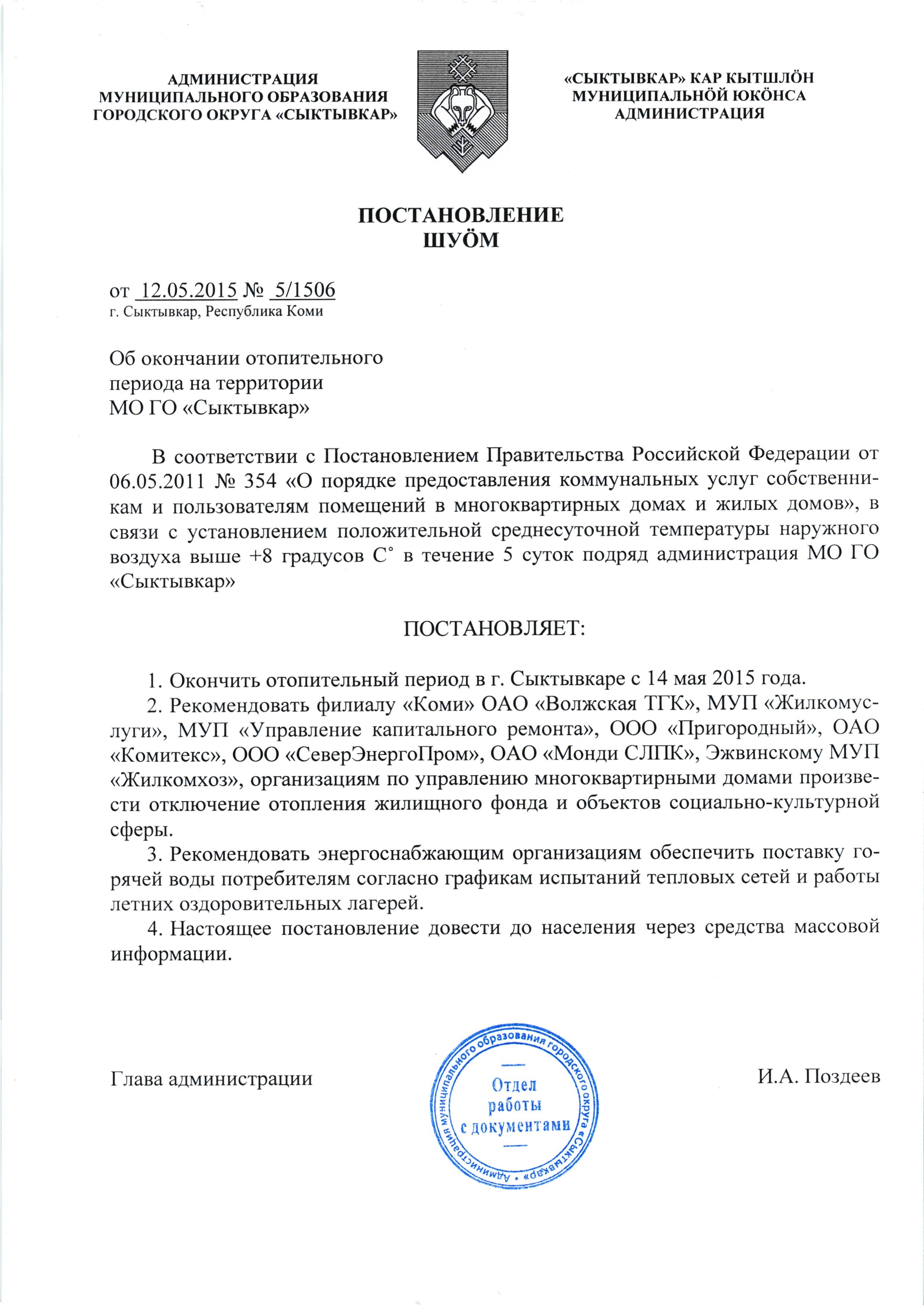 Постановление администрации МО ГО "Сыктывкар" от 12.05.2015 "Об окончании отопительного периода на территории МО ГО "Сыктывкар"