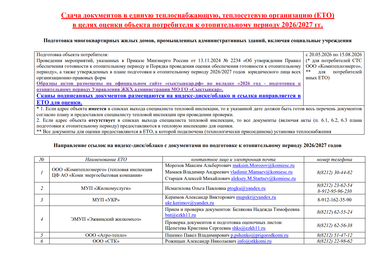 Памятка по сдаче документов в теплосетевую, теплоснабжающую организацию с целью оценки объекта (юридического лица) к отопительному периоду 2026/2027 годов с указанием ответственного лица и контактных данных