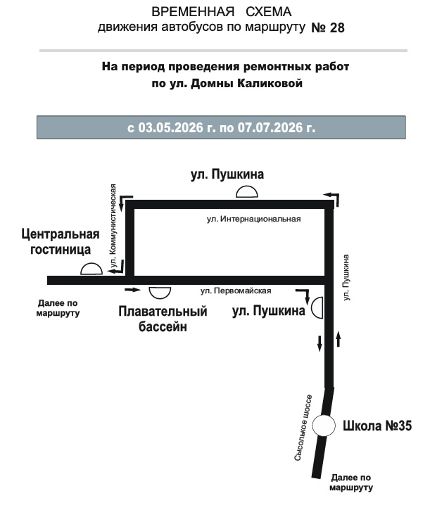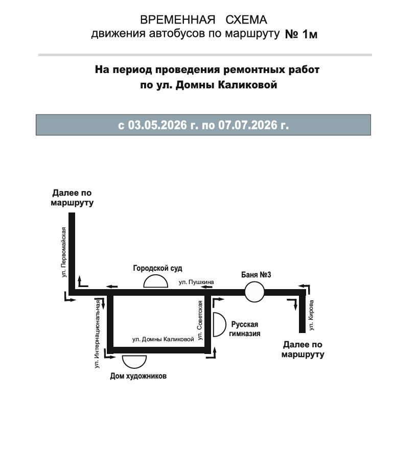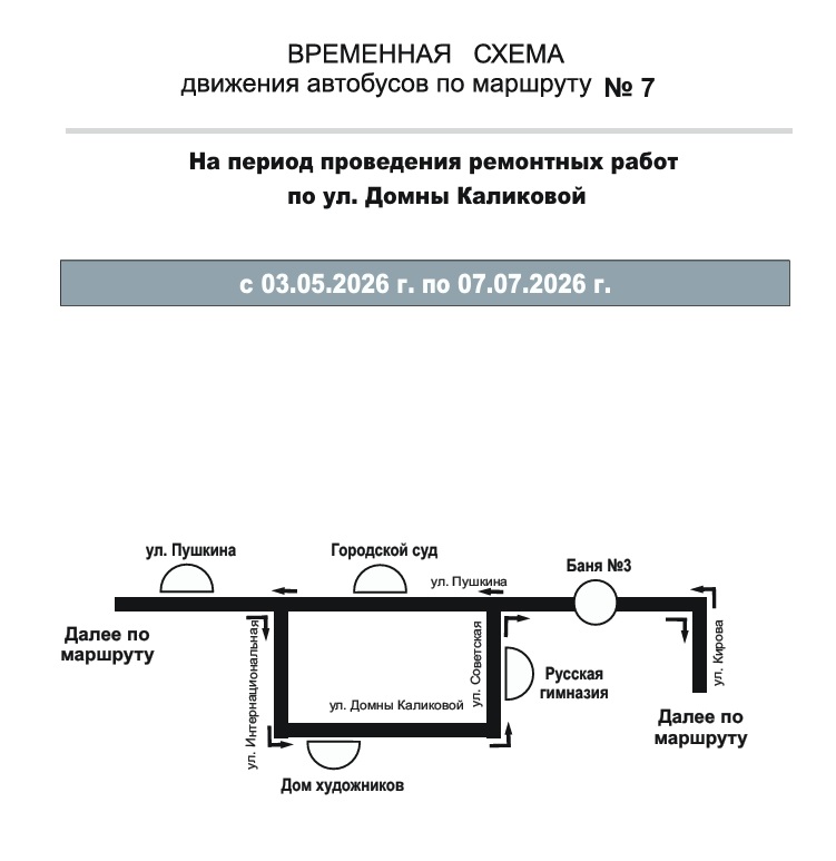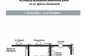 С 03.05.2026 по 07.07.2026 в связи с проведением ремонтных работ будет перекрыто движение автомобильного транспорта по ул. Домны Каликовой от ул. Южной до ул. Интернациональной.