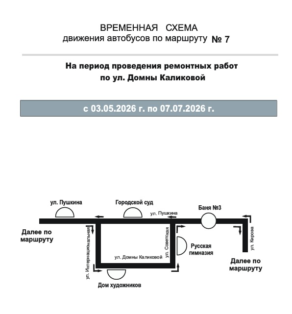 Маршрут № 7: в прямом направлении: ул. Пушкина – ул. Интернациональная – ул. Домны Каликовой – ул. Советская – ул. Пушкина – ул. Кирова – далее по маршруту;
