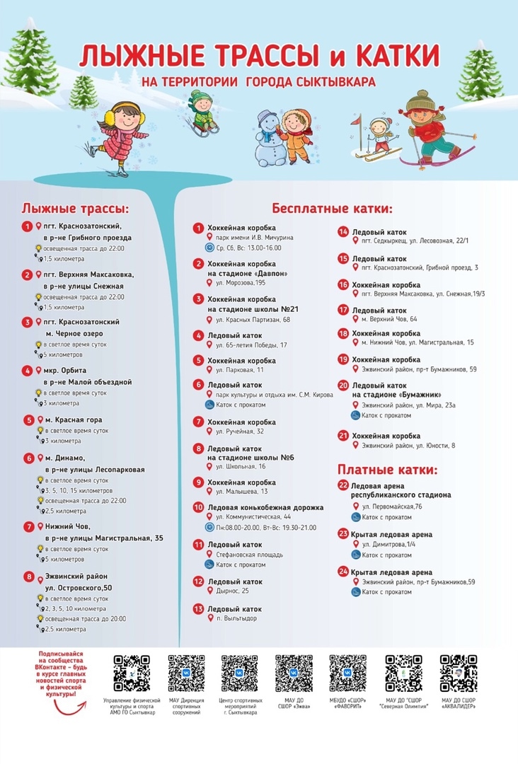 Места расположения уличных катков и лыжных трасс можно увидеть в прикрепленной карточке.